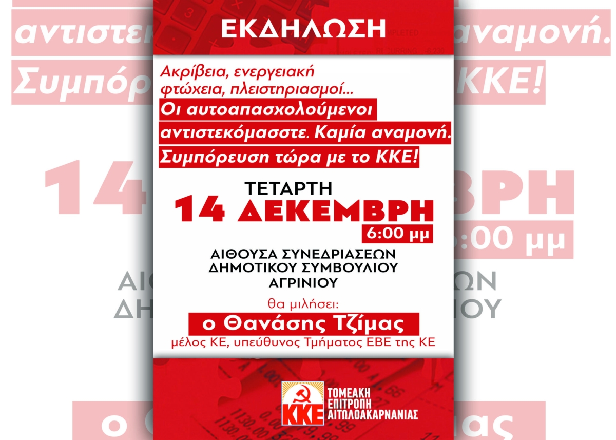 Εκδήλωση με τίτλο «Ακρίβεια, ενεργειακή φτώχεια, πλειστηριασμοί… Οι αυτοαπασχολούμενοι αντιστεκόμαστε. Καμία αναμονή. Συμπόρευση τώρα με το ΚΚΕ!», διοργανώνει η Τομεακή Επιτροπή Αιτωλοακαρνανίας του ΚΚΕ.