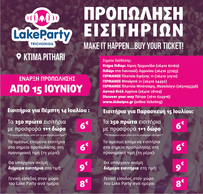Στις 14 και 15 Ιουλίου, το ένα από τα δυο καλοκαιρινά lake partys ξεκινά και τις δυο ημέρες με τα γνωστά αθλήματα: Lake Sports, Lake Volley by Lipton και Canoe-Kayak. Όσον αφορά στους καλεσμένους να πούμε πως τη πρώτη μέρα θα ξεσηκώσουν το κοινό οι Imam Baildi, ενώ τη δεύτερη ημέρα εμφανίζονται: 48 ώρες (έχουν έρθει ξανά), Lukia, Gioli (είναι η πρώτη φορά που έρχεται ένας καλλιτέχνης από το εξωτερικό), Otherview και φυσικά οι Onirama.