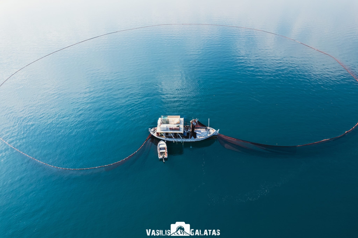 Η βάρκα βγήκε και τα δίχτυα της απλώνει με την εικόνα της λίμνης από ψηλά να είναι εντυπωσιακή.