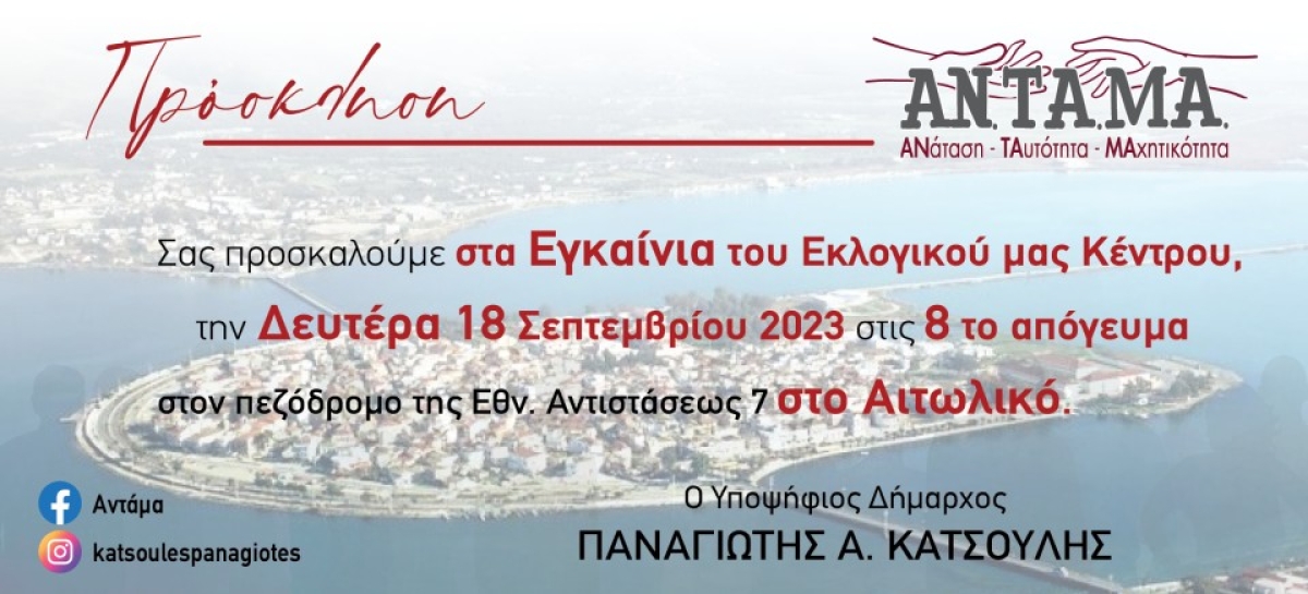 Σας προσκαλούμε στα εγκαίνια του εκλογικού μας κέντρου στον πεζόδρομο της Εθνικής Αντιστάσεως 7 στο Αιτωλικό, τη Δευτέρα 18 Σεπτεμβρίου και ώρα 8μμ.