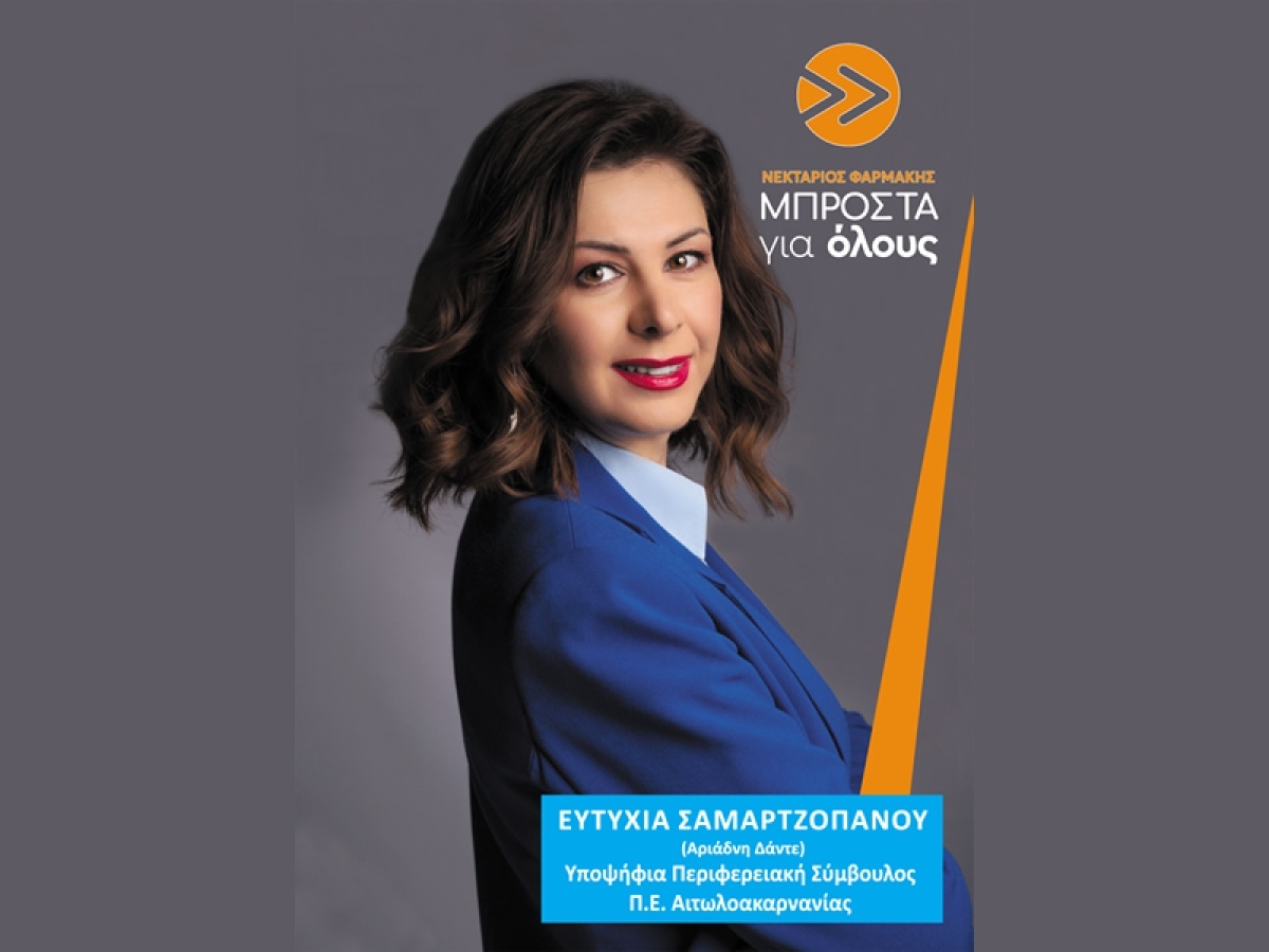H Ευτυχία Σαμαρτζοπάνου (Αριάδνη Δάντε) Υποψήφια Περιφερειακή Σύμβουλος Π. Ε. Αιτωλοακαρνανίας στον συνδυασμό "ΜΠΡΟΣΤΑ για όλους" του Νεκτάριου Φαρμάκη