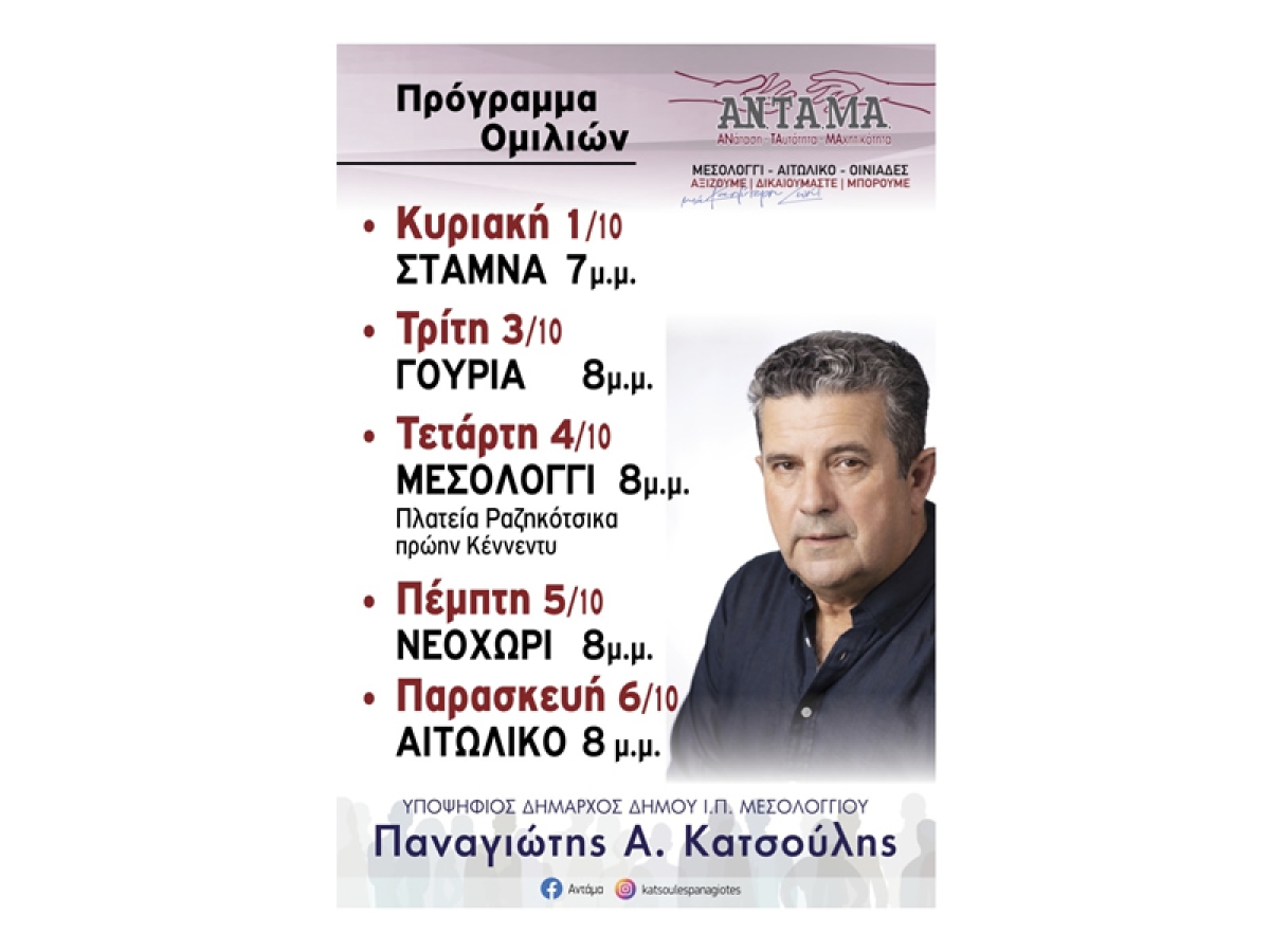 • Τετάρτη 4/10 ΜΕΣΟΛΟΓΓΙ 8μ.μ. Πλατεία Ραζηκότσικα πρώην Κέννεντυ