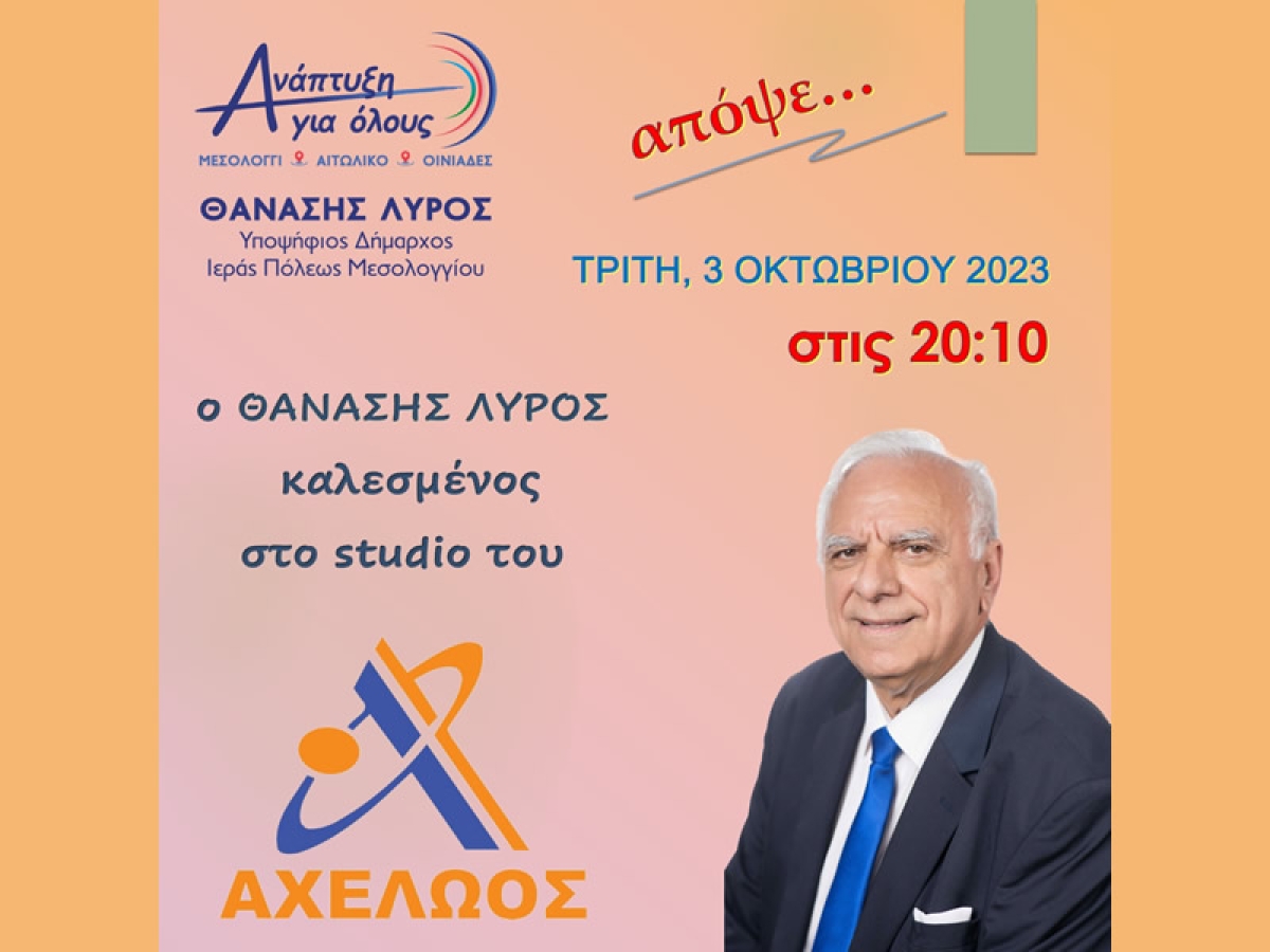 Ο επικεφαλής τού συνδυασμού "Ανάπτυξη για όλους", υποψήφιος Δήμαρχος Ιεράς Πόλεως Μεσολογγίου, Θανάσης Λύρος, καλεσμένος, απόψε, Τρίτη, 3 Οκτωβρίου 2023, στο studio του ΑΧΕΛΩΟΣ TV.