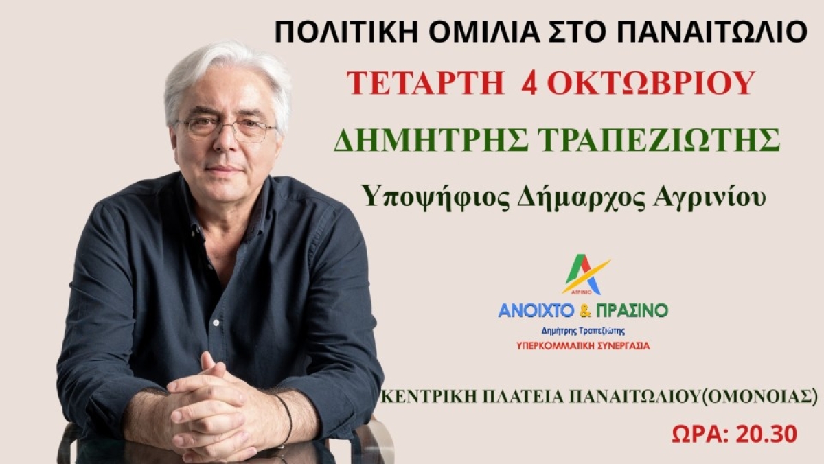 Αύριο Τετάρτη 4 Οκτωβρίου, ο υποψήφιος Δήμαρχος Αγρινίου, Δημήτρης Τραπεζιώτης θα πραγματοποιήσει ομιλία στην κεντρική πλατεία Παναιτωλίου(πλατεία Ομονοίας) και ώρα 20.30.