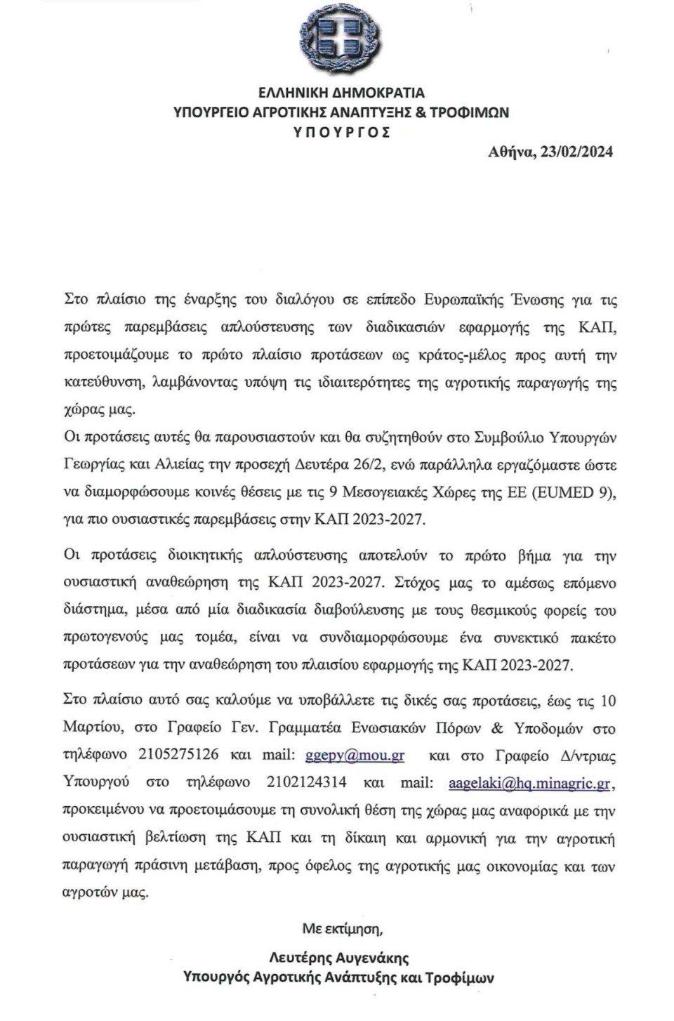 Με επιστολή του στους θεσμικούς φορείς και τα κόμματα, το ΥΠΑΑΤ ζητεί προτάσεις για δομικές αλλαγές στην ΚΑΠ- «Απαιτείται ισχυρή συμμαχία σε εθνικό και ευρωπαϊκό επίπεδο- Να γίνουμε όλοι μια γροθιά»