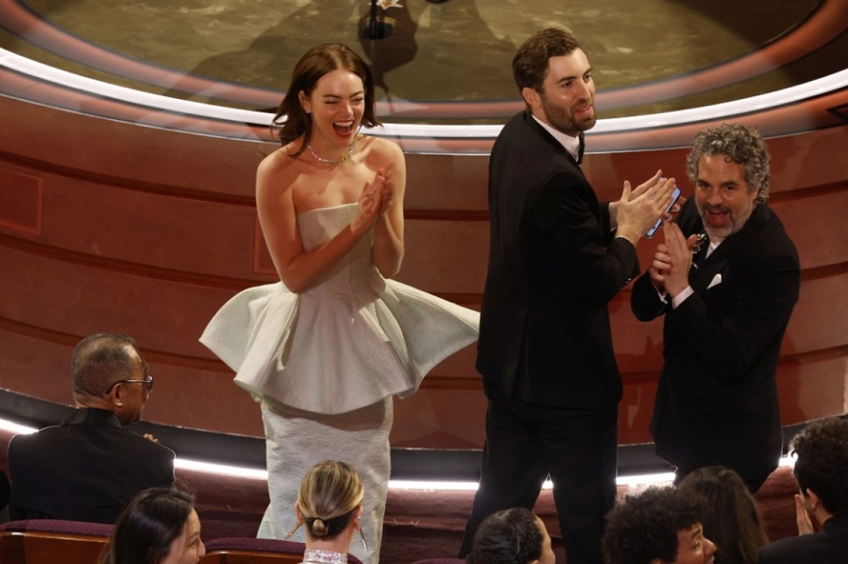 Η Έμμα Στόουν σοκαρισμένη, σαν να μην το περίμενε, ανέβηκε στη σκηνή, ζητώντας βοήθεια για το φόρεμά της. «Χάλασε το φόρεμά μου, πάει και η φωνή μου» θα πει, και ευχαριστεί τις συνυποψήφιές της. «Έπαθα άλλη μια κρίση πανικού τις προάλλες […] ο Γιώργος με συμβούλεψε να το βγάλω από το μυαλό μου. Γιώργο σ’ ευχαριστώ για αυτή την ταινία, για αυτό τον ρόλο που άλλαξε τη ζωή μου. Ξέρω ότι έχω περιορισμένο χρόνο αλλά επιτρέψτε μου να ευχαριστήσω την οικογένειά μου, την μητέρα μου, τον άντρα μου, την κόρη μου που γίνεται τριών σε λίγες μέρες και έχει κάνει τη ζωή μου πολύχρωμη και σινεμασκόπ». Τέλος προέτρεψε το κοινό και τους παρευρισκομένους να μην κοιτάξουμε το σπασμένο φερμουάρ από το φόρεμά της όταν θα αποχωρούσε από τη σκηνή.