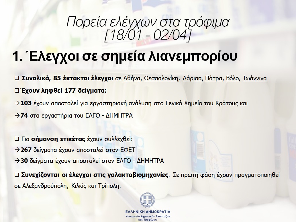 Ö 177 δείγματα γαλακτοκομικών προς χημικό έλεγχο από σημεία λιανεμπορίου και 267 για έλεγχο ετικέτας
