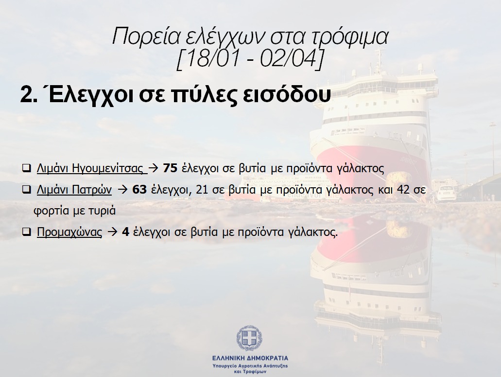 - Στο λιμάνι των Πατρών έχουν γίνει 63 έλεγχοι (21 σε βυτία προϊόντων γάλακτος και 42 σε φορτία με τυριά).