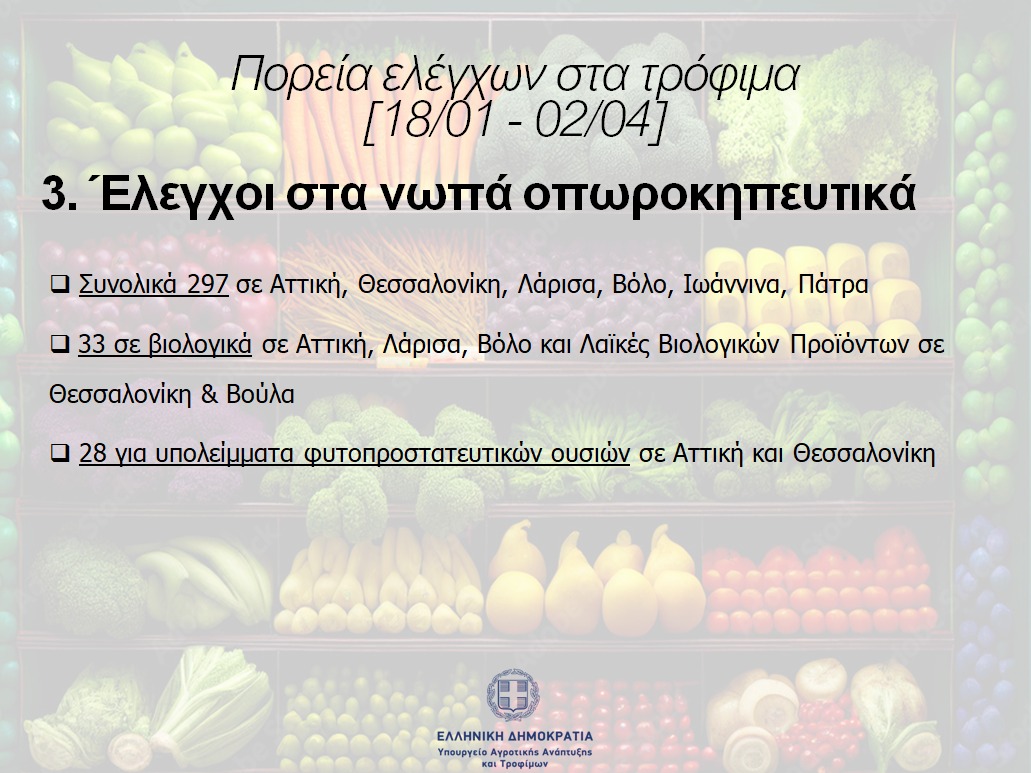- Σε βιολογικά: 33 έλεγχοι (Αττική 24, Λάρισα 2, Βόλος 5, Θεσσαλονίκη και Βούλα στις Λαϊκές Βιολογικών Προϊόντων).