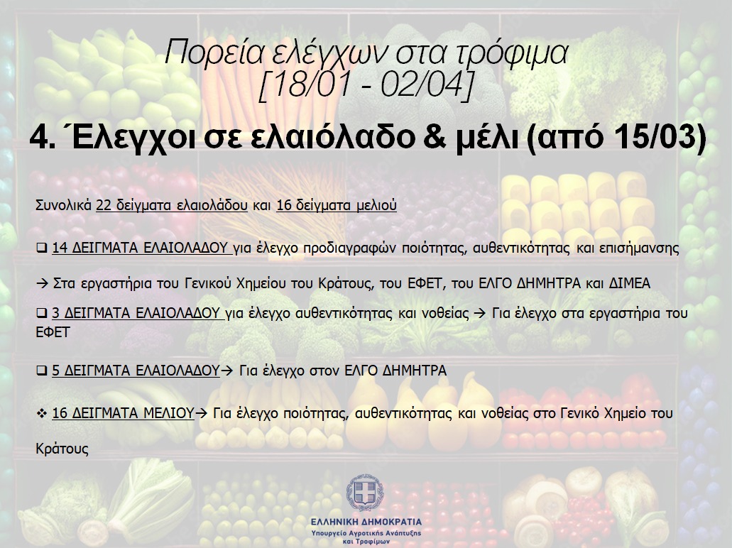 Από τις 15.03.2024 τα μικτά κλιμάκια διενεργούν ελέγχους στο ελαιόλαδο και στο μέλι. Συνολικά έχουν ληφθεί 22 δείγματα ελαιολάδου και 16 δείγματα μελιού.