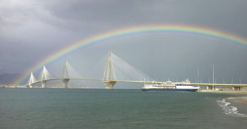 Πιο συγκεκριμένα το ουράνιο τόξο μοιάζει να έχει τις βάσεις του στο Ρίο και το Αντίρριο, «ενώνοντας» με την μοναδική του ομορφιά του τις δύο ακτές του Κορινθιακού.