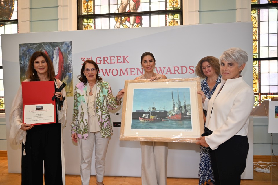 Η Ειρήνη Βενιάμη επίσης από τον χώρο της ναυτιλίας και η Managing Director της Credit Agricole στην Ελλάδα Νικολέτα Παναγιωτοπούλου, της επέδωσαν το βραβείο-αντίγραφο του έργου «Ημερολόγιο ενός πλοίου» του αείμνηστου ζωγράφου Παύλου Σάμιου.