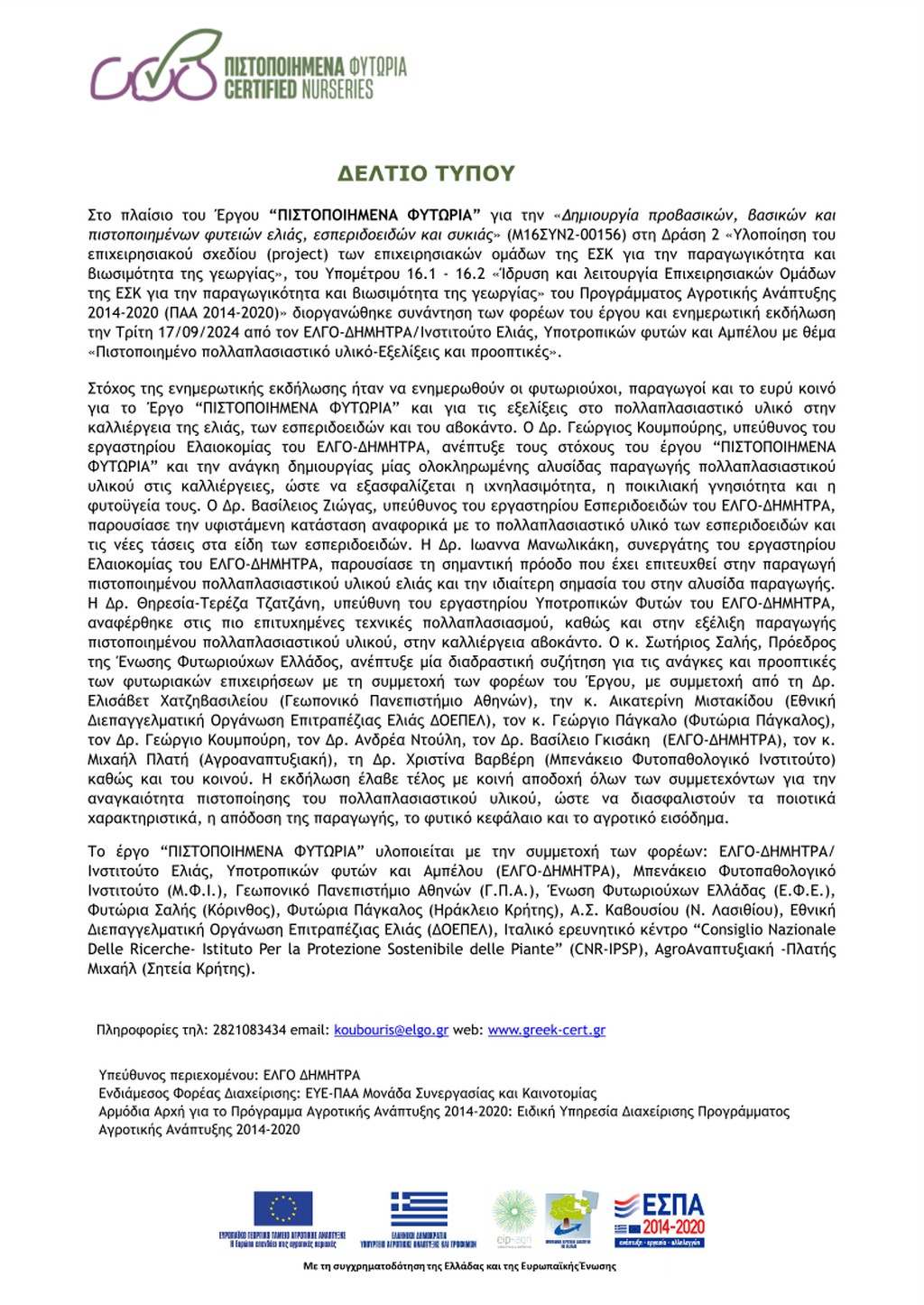 Στο πλαίσιο του Έργου “ΠΙΣΤΟΠΟΙΗΜΕΝΑ ΦΥΤΩΡΙΑ” για την «Δημιουργία προβασικών, βασικών και πιστοποιημένων φυτειών ελιάς, εσπεριδοειδών και συκιάς» (Μ16ΣΥΝ2-00156) στη Δράση 2 «Υλοποίηση του επιχειρησιακού σχεδίου (project) των επιχειρησιακών ομάδων της ΕΣΚ για την παραγωγικότητα και βιωσιμότητα της γεωργίας», του Υπομέτρου 16.1 - 16.2 «Ίδρυση και λειτουργία Επιχειρησιακών Ομάδων της ΕΣΚ για την παραγωγικότητα και βιωσιμότητα της γεωργίας» του Προγράμματος Αγροτικής Ανάπτυξης 2014-2020 (ΠΑΑ 2014-2020)» διοργανώθηκε συνάντηση των φορέων του έργου και ενημερωτική εκδήλωση την Τρίτη 17/09/2024 από τον ΕΛΓΟ-ΔΗΜΗΤΡΑ/Ινστιτούτο Ελιάς, Υποτροπικών φυτών και Αμπέλου με θέμα «Πιστοποιημένο πολλαπλασιαστικό υλικό-Εξελίξεις και προοπτικές».