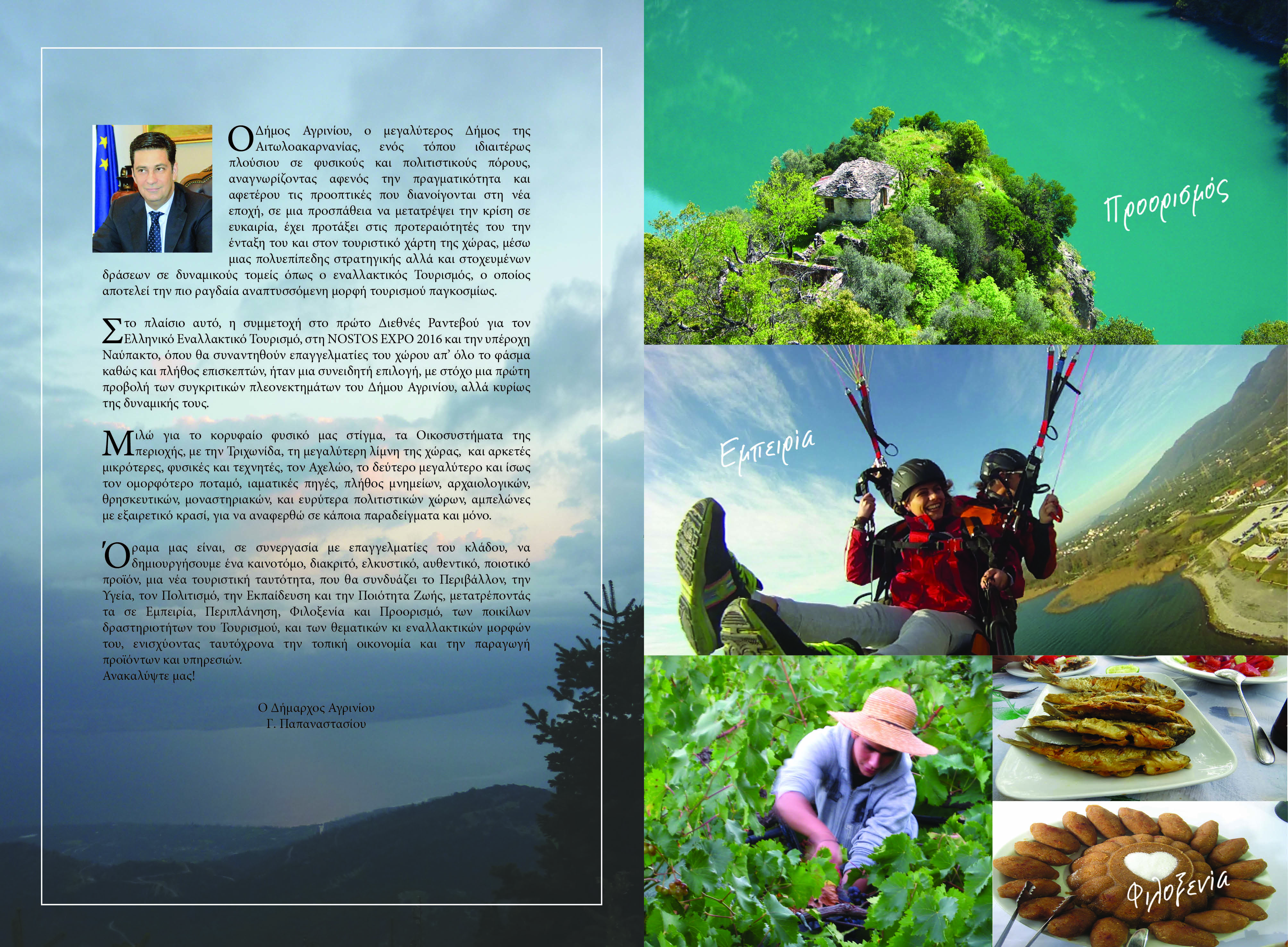 Στο πλαίσιο αυτό, η συμμετοχή στο πρώτο Διεθνές Ραντεβού για τον Ελληνικό Εναλλακτικό Τουρισμό, στη NOSTOS EXPO 2016 και την υπέροχη Ναύπακτο, όπου θα συναντηθούν επαγγελματίες του χώρου απ’ όλο το φάσμα καθώς και πλήθος επισκεπτών, ήταν μια συνειδητή επιλογή, με στόχο μια πρώτη προβολή των συγκριτικών πλεονεκτημάτων του Δήμου Αγρινίου, αλλά κυρίως της δυναμικής τους.