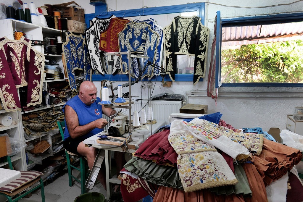 Το δυνατό φως της ηλιόλουστης και πολύ ζεστής ημέρας, μπαίνει από τα βιομηχανικού τύπου παράθυρα φανερώνοντας το περιεχόμενο του χώρου. Υφάσματα σε τόπια, γνώριμα σε αποχρώσεις και υφές σε όποιον έχει έστω και λίγη επαφή με την ελληνική παράδοση, έτοιμα κομμάτια σε κρεμάστρες στους τοίχους, γιλέκα και διακοσμητικά κυρίως, ζώνες, κουμπιά, καρφίτσες, κεφαλόδεσμοι, τζοβαΐρια αλλά και έτοιμες στολές σε ζελατίνες, κλωστές πολύχρωμες, επαγγελματικές ραπτομηχανές και ένας πάγκος με γνώμονα μιλιμετρέ, γεμίζουν κυριολεκτικά το μεγάλο δωμάτιο.