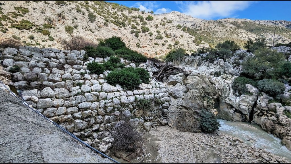 Στη νέα στέψη του φράγματος υπήρχε δίοδος εκτροπής των νερών του χειμάρρου και υπερχείλισης των πλημμυρικών παροχών πάνω από συμπαγή ασβεστολιθική μάζα στο αριστερό αντέρεισμα, ώστε να αποφεύγεται η υπερπήδηση του φράγματος. Ο υπερχειλιστής διαμορφώθηκε σταδιακά με διάβρωση του ασβεστολιθικού πετρώματος και τη δημιουργία βαθιάς εγκοπής που διευρύνθηκε κατά τόπους από τη ροή νερού και φερτών υλικών. Το εσωτερικό του φράγματος έχει αποκαλυφθεί τοπικά μετά από διάβρωση και απομάκρυνση των λίθων της επιφανειακής στρώσης, λόγω υπερπήδησης.