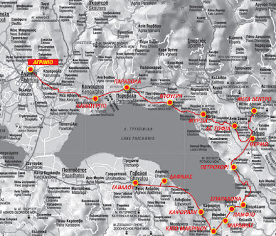 - Ένας χάρτης της λίμνης Τριχωνίδας. Τα στοιχεία που συνδέουν το Αγρίνιο με το νερό, όπως οι λίμνες, η αλιεία, η άρδευση και η ζωή γύρω από το υδάτινο στοιχείο, είναι βαθιά ενσωματωμένα στην ταυτότητα της περιοχής.