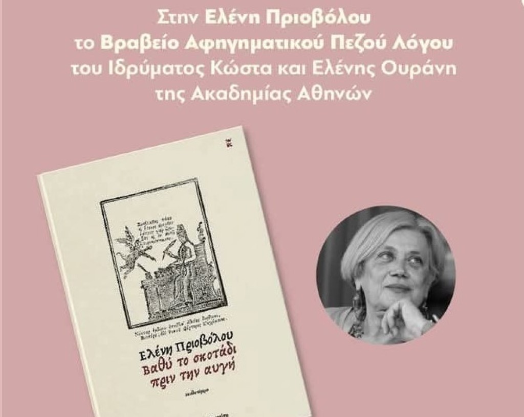 Στον δικό μας άνθρωπο, στην αγαπημένη μας Ελένη Πριοβόλου απονεμήθηκε το βραβείο αφηγηματικού πεζού Λόγου του ιδρύματος Κώστα και Ελένης Ουράνη της Ακαδημίας Αθηνών για το τελευταίο της βιβλίο “βαθύ το σκοτάδι πριν την αυγή”