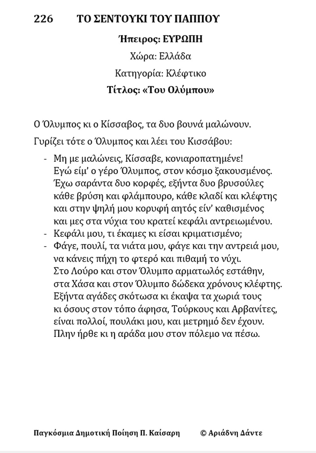 Στη συνέχεια, η Αριάδνη Δάντε άνοιξε το σεντούκι του παππού και διάλεξε τυχαία το Ελληνικό ποίημα με τίτλο «Του Ολύμπου». Το ποίημα βρίσκεται στη θέση 226 του Α΄ Τόμου Παγκόσμιας Δημοτικής Ποίησης του Περικλή Καίσαρη της Κατηγορίας: Κλέφτικο.