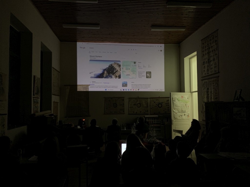 Όταν ολοκληρώθηκε η ασφαλής μας περιήγηση στο Διαδίκτυο, ο κ. Παύλος εμπνεύστηκε από το εικαστικό έργο, τις πληροφορίες και την αφήγηση και μας ταξίδεψε στον κόσμο της γνώσης και της φαντασίας του. Μπήκε με ενθουσιασμό στο ποίημα του Ολύμπου και μας εξιστόρησε τα όσα έζησε, καθώς άκουγε τα δύο βουνά που μάλωναν. Μαζί του, είδαμε με τα μάτια της ψυχής μας όλα αυτά που μας περίγραψε, συναντηθήκαμε με την αρκούδα της ιστορίας και γευτήκαμε και το νοστιμότερο μέλι σε μια από τις σπηλιές του βουνού. Μάλιστα, φτάσαμε και ως την κορυφή του και είδαμε από μακριά και τον Δία με τους άλλους θεούς.