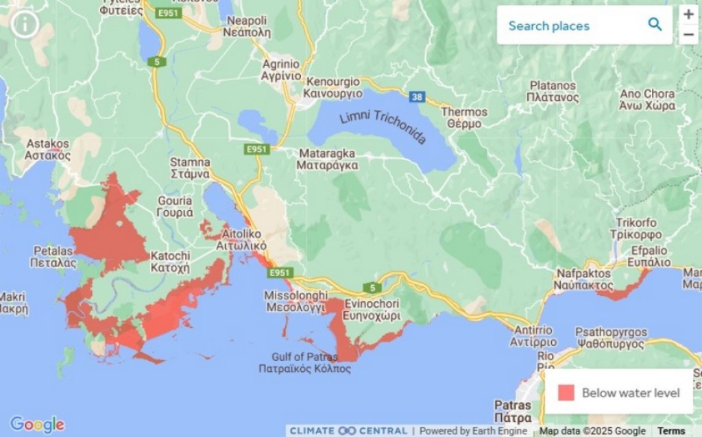 Τις ελληνικές πόλεις απειλεί η κλιματική αλλαγή με την άνοδο της στάθμης της θάλασσας, ανάμεσα τους το Μεσολόγγι και η Αμφιλοχία.