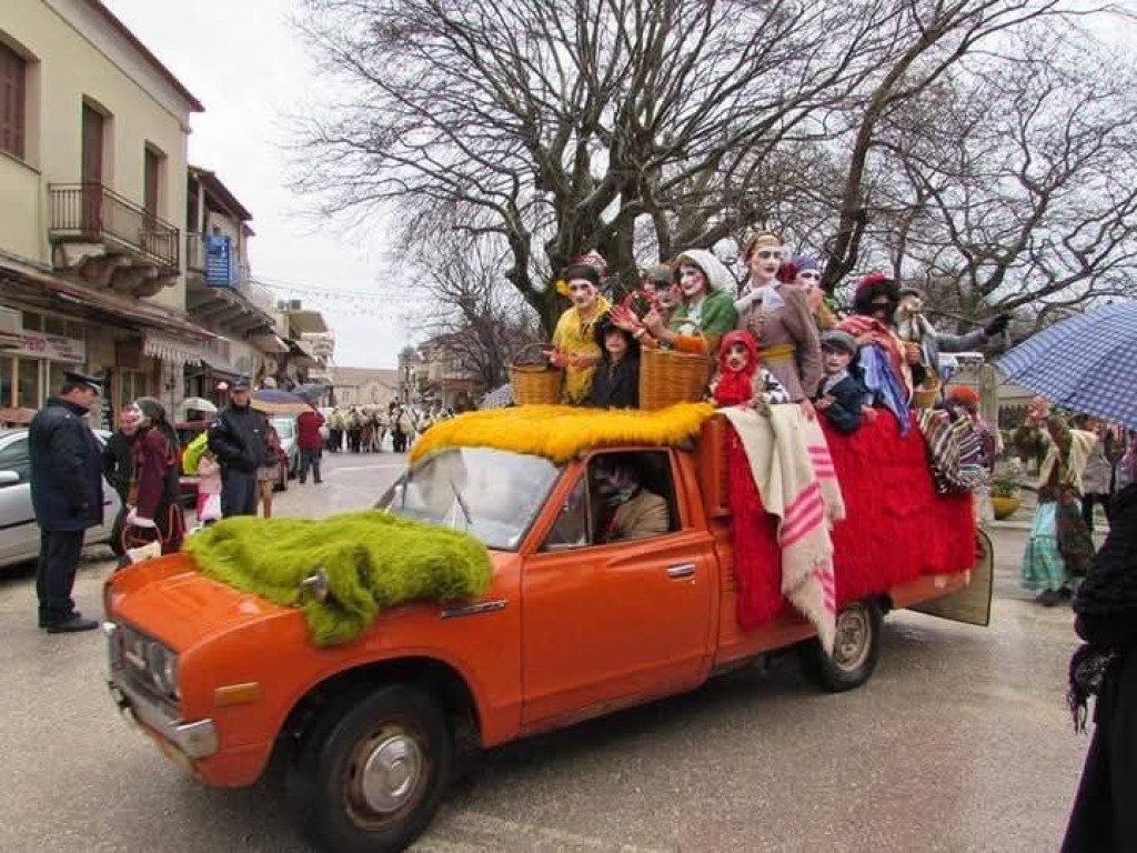 Ημέρες Αποκριάς, αναπαράσταση βλάχικου γάμου, με έκθεση- περιφορά, προικιών στο Θέρμο της Αιτωλίας, σε δρώμενα μεταμφιεσμένων καρναβαλιστών, εποχούμενων επί αγροτικού οχήματος τύπου Datsun.