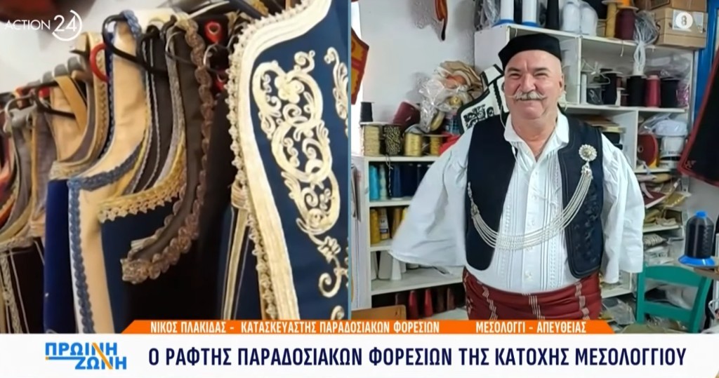 Γεννημένος στην Κατοχή Μεσολογγίου, ο Νίκος Πλακίδας, ένας από τους λίγους ράφτες Ελληνικών παραδοσιακών φορεσιών, μας ξεναγεί στο εργαστήριό του και μας μιλά για το ξεχωριστό του έργο.
