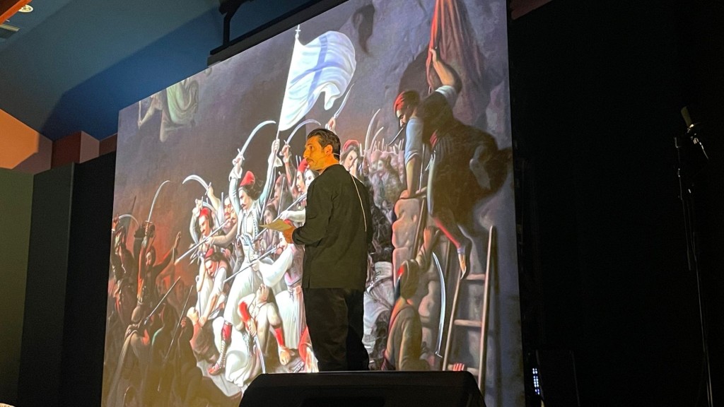 Με αφετηρία την αφηγηματική διήγηση και κατάληξη την περφόρμανς, ο Γιώργος Γεροντιδάκης ερμήνευσε προς χάρη του κοινού, που παρακολουθούσε με μεγάλη προσήλωση και συγκίνηση, φανερούς αλλά και λιγότερο προφανείς συμβολισμούς του εμβληματικού πίνακα που αποτυπώνει τη στιγμή της Εξόδου, τη στιγμή που οι Εξοδίτες μετατρέπονται σε ήρωες αιωνίως τιμώμενους.