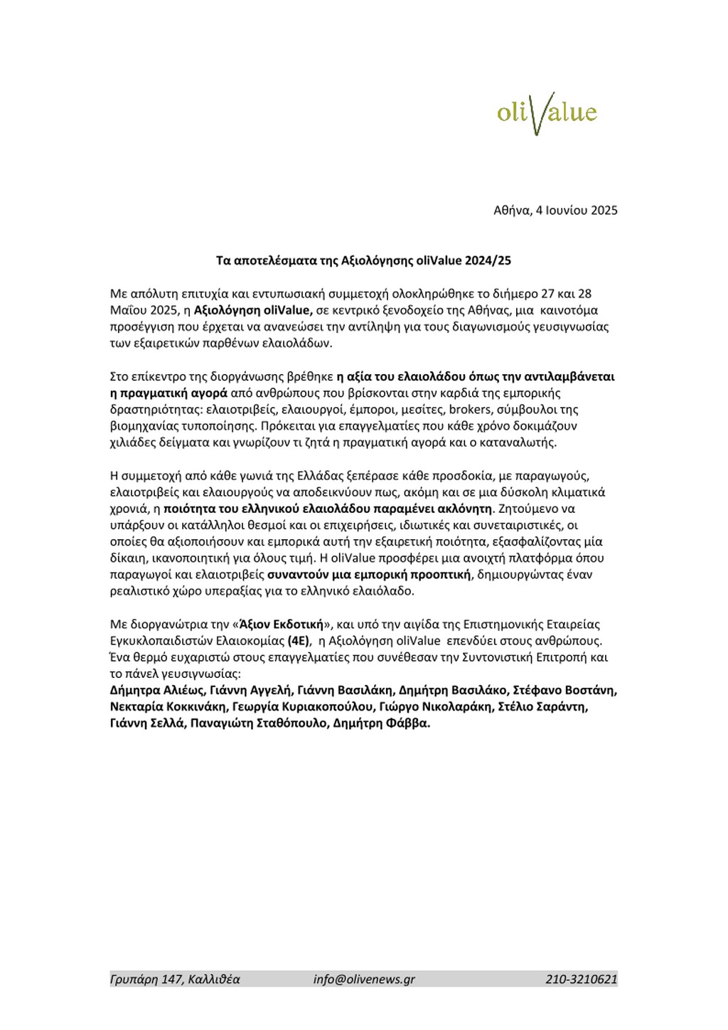 Η απονομή των βραβείων μαζί με μία εκδήλωση – έκπληξη θα πραγματοποιηθεί το φθινόπωρο, ενώ ήδη ξεκίνησε με αισιοδοξία η προετοιμασία για την 2η Αξιολόγηση oliValue 2025/2026.