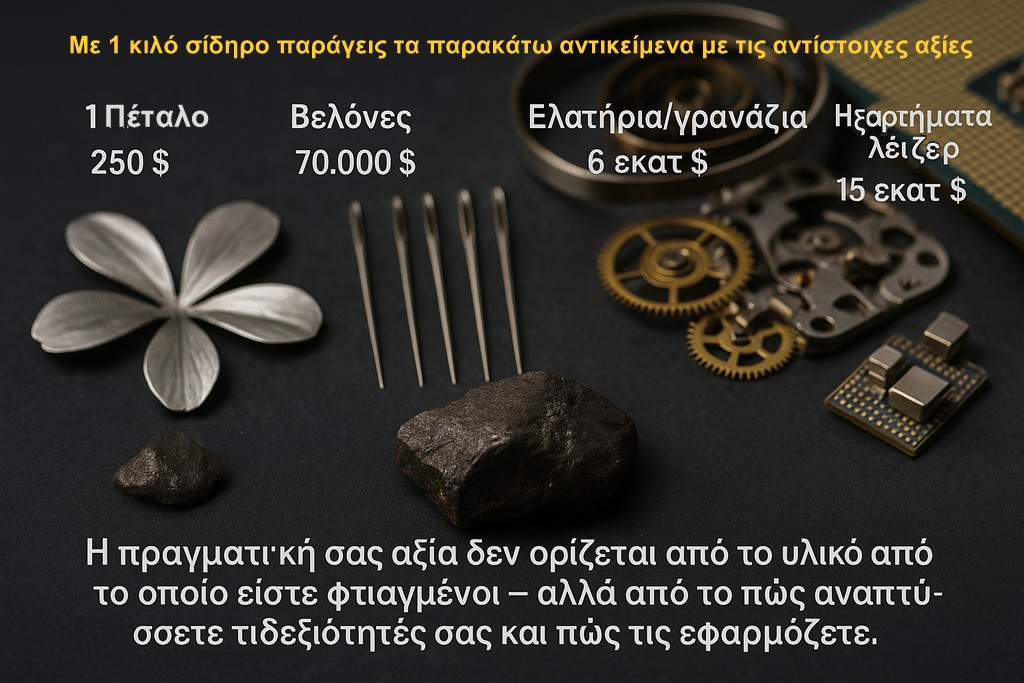 1 kg σιδήρου κοστίζει 100 $. Αν την μετατρέψετε σε πέταλα αξίζουν 250$. Αν κάμετε βελόνες ραψίματος αξίζουν 70.000$. Αν φτιάξετε ελατήρια ή γρανάζια ρολογιών θα αξίζουν 6 εκατ$. Άν την επεξεργαστείτε σε εξαρτήματα λέιζερ υψηλής τεχνολογίας που χρησιμοποιούνται σε τσιπ υπολογιστών, ένα κιλό σιδήρου θα αξίζει 15 εκατ$. «Η πραγματική σας αξία δεν ορίζεται από το υλικό από το οποίο είστε φτιαγμένοι - αλλά από το πώς αναπτύσσετε τις δεξιότητές σας και πώς τις εφαρμόζετε».