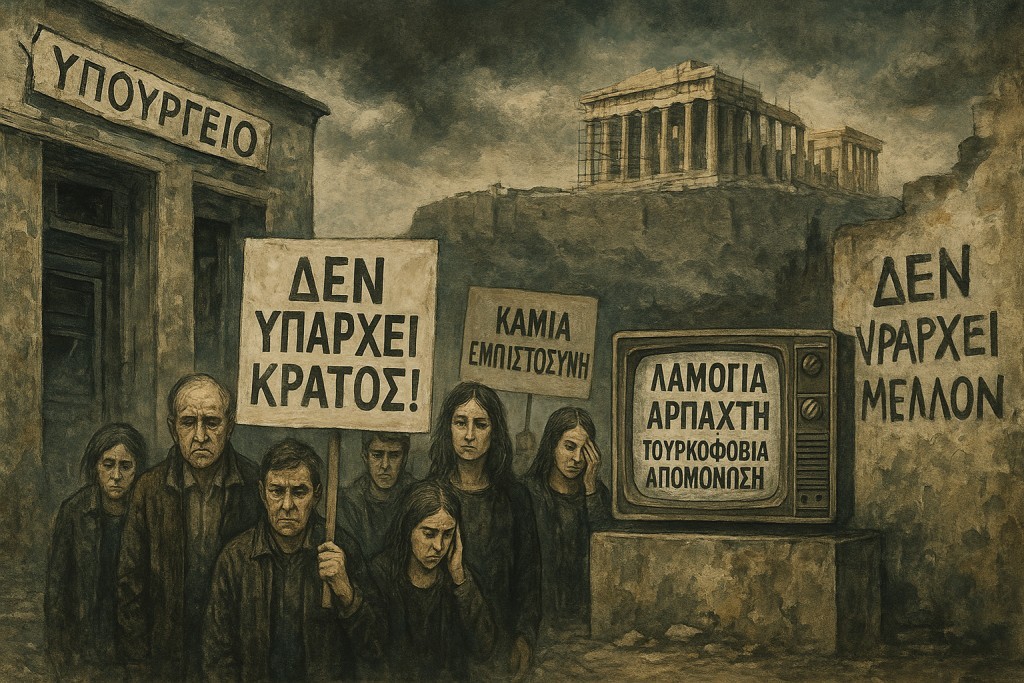 Αν κάνουμε μια μικρή έρευνα στην ελληνική κοινωνία, θα διαπιστώσουμε ότι παντού υπάρχουν οι ίδιες φωνές θλιβερής διαπίστωσης: Δεν υπάρχει κράτος! Δεν δουλεύει τίποτε! Καμία εμπιστοσύνη! Παντού «λαμογιά και αρπαχτή»! Διεθνής απομόνωση! Τουρκοφοβία! Δεν υπάρχει μέλλον!