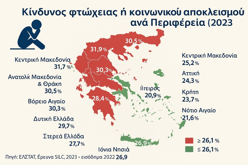 Αντανάκλαση των παραπάνω μεταβολών που περιγράφονται στα βασικά συμπεράσματα είναι και οι παρατηρούμενες ασυμμετρίες μεταξύ περιφερειών όσον αφορά βασικούς δείκτες της ποιότητας ζωής των κατοίκων τους. Ενδεικτικά, στις περισσότερες περιφέρειες της χώρας το ποσοστό του πληθυσμού σε κίνδυνο φτώχειας ή κοινωνικού αποκλεισμού παρέμεινε το 2024 σε επίπεδο υψηλότερο του μέσου όρου της ΕΕ. Τα υψηλότερα ποσοστά εντοπίζονται, μεταξύ άλλων, στις περιφέρειες Ιονίων Νήσων (41,4%), Δυτικής Μακεδονίας (36,3%), Δυτικής Ελλάδας (35,2%), Ανατολικής Μακεδονίας – Θράκης (33,8%), Βορείου Αιγαίου (33,2%) και Πελοποννήσου (32,3%).