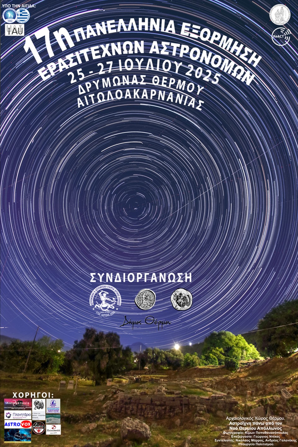 Η εικόνα της αφίσας, με τα startrails (αστροΐχνη) να κυκλώνουν τον Ναό του Απόλλωνα στον αρχαιολογικό χώρο Θέρμου, δεν ήταν τυχαία. Συμβολίζει ακριβώς αυτό που προσπαθήσαμε να κάνουμε: να ενώσουμε τον αρχαίο κόσμο με τον σύγχρονη ματιά προς τον ουρανό. Να δείξουμε πως ο τόπος αυτός δεν έχει μόνο παρελθόν, αλλά και ουράνιο μέλλον. Δε θα μπορούσαμε να το πετύχουμε αυτό όμως χωρίς την υποστήριξη της εφορείας αρχαιοτήτων Αιτωλοακρνανίας και Λευκάδος, και συγκεκριμένα από τη Δρ. Φραγκούλα Γεώρμα υπεύθυνη του αρχαιολογικού χώρου του αρχαίου Θέρμου και την υπέυθυνη της εφορείας Αρχαιοτήτων Δρ. Φωτεινή Σαράντη. Τις ευχαριστούμε θερμά για υποστήριξη και τον χρόνο που διαθέσανε για τις προετοιμασίες, τη κ. Γεώρμα για την εξαιρετική διάλεξη που έκανε στις ομιλίες της εξόρμησης παρουσιάζοντας τις αρχαιότητες της Αιτωλοακαρνανίας, καθώς και για την υποστήριξη για την άδεια που χρειαζόταν από το Υπουργείο Πολιτισμού, για τη φωτογράφισης του ναού του Απόλλωνα στο αρχαίο Θέρμο.