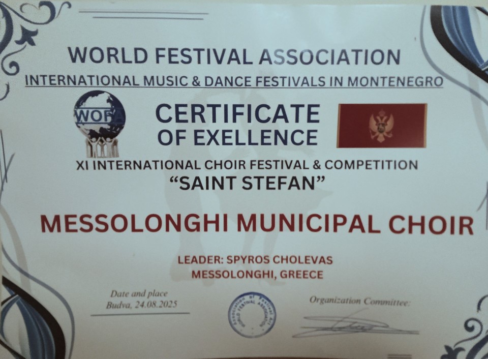 Μεγάλη διάκριση για τη Χορωδία του Δήμου Ιεράς Πόλεως Μεσολογγίου αποτέλεσε η κατάκτηση του Βραβείου Αριστείας στο ΙΧ Διεθνές Χορωδιακό Φεστιβάλ «Saint Stefan», που πραγματοποιήθηκε στις 24 Αυγούστου 2025 στην παραθαλάσσια πόλη Μπούτβα του Μοντενέγκρο.