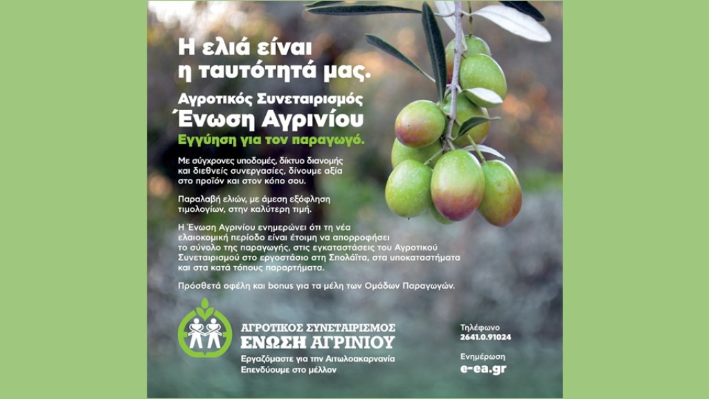 Η Ένωση Αγρινίου, με την Ολοκληρωμένη Διαχείριση που εφαρμόζει (κατά agro 2.1 – 2.2), με τις υποδομές που έχει δημιουργήσει (εργοστάσιο, δίκτυο διανομής), με τη δυναμική και τις συνεργασίες που έχει αναπτύξει στη χώρα και στο εξωτερικό και με την εμπειρία δεκαετιών στο χώρο, εγγυάται το καλύτερο για τους ελαιοπαραγωγούς, με πλήρη διασφάλιση του εισοδήματός τους.