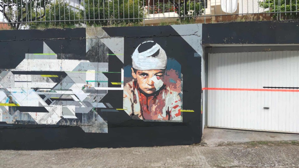 Ένα από τα αθώα θύματα του πολέμου, ένα παιδί βουτηγμένο στο αίμα και τη φρίκη, αποτυπώνει με συγκλονιστικό τρόπο σε έργο του, στην οδό Βλαχερνών στο Αγρίνιο, ο Δημήτρης Δήμας.