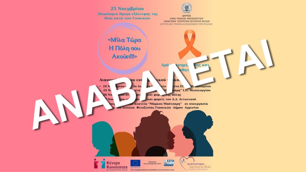 Η Δημοτική Επιτροπή Ισότητας και το Αυτοτελές Τμήμα Κοινωνικής Προστασίας του Δήμου Ιερής Πόλης Μεσολογγίου ενημερώνουν ότι αναβάλλεται λόγω κακοκαιρίας η εκδήλωση στην κεντρική πλατεία Μάρκου Μπότσαρη που ήταν προγραμματισμένη για σήμερα Τρίτη, 25 Νοεμβρίου 2025, στο πλαίσιο της εβδομάδας ενημέρωσης και ευαισθητοποίησης για την εξάλειψη της βίας κατά των Γυναικών «Μίλα τώρα – η Πόλη σου Ακούει!».