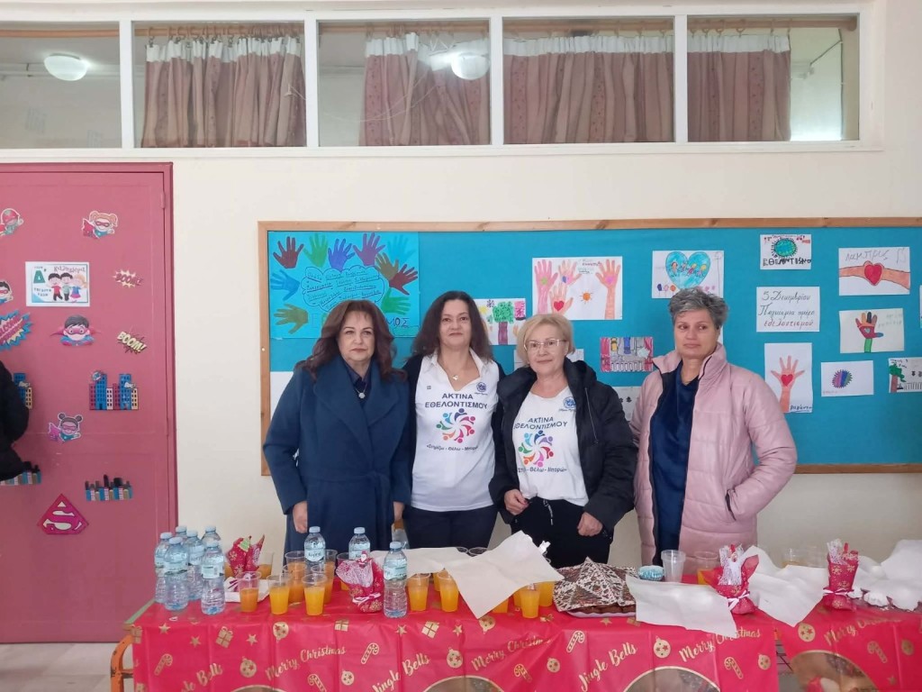 «Την ημέρα αυτή είχαμε την τιμή να υποδεχθούν στο σχολείο τους την «Ακτίνα Εθελοντισμού», με επικεφαλής την κ. Βούλα Γουργολίτσα. Οι μαθητές, με τον ενθουσιασμό που τους διακατείχε, υποδέχτηκαν τους εθελοντές τραγουδώντας παραδοσιακά κάλαντα και δημιουργώντας μια ζεστή και γιορτινή ατμόσφαιρα. Παράλληλα, ο Σύλλογος Γονέων και Κηδεμόνων του σχολείου, με πρόεδρο την κ. Αμαλία Σκαρμούτσου, είχε ετοιμάσει κεράσματα για μικρούς και μεγάλους, ενισχύοντας το κλίμα συνεργασίας και χαράς.