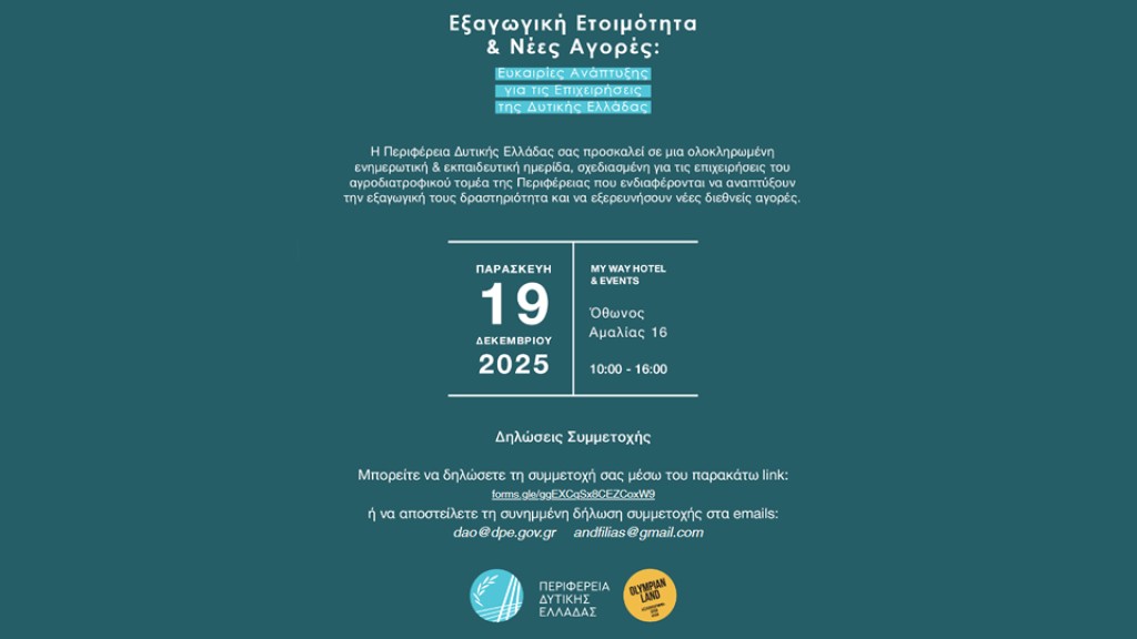 Η ημερίδα απευθύνεται σε επιχειρήσεις του αγροδιατροφικού τομέα της Περιφέρειας Δυτικής Ελλάδας που ενδιαφέρονται να αναπτύξουν την εξαγωγική τους δραστηριότητα και να εξερευνήσουν νέες διεθνείς αγορές.