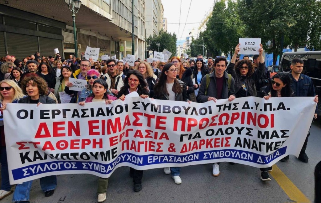 Στους δρόμους της Αθήνας κατέβηκαν την Παρασκευή 3 Απριλίου 2026 συμβασιούχοι εργασιακοί σύμβουλοι της ΔΥΠΑ από όλη την επικράτεια, διεκδικώντας άμεση λύση για τη διασφάλιση των θέσεων εργασίας τους.