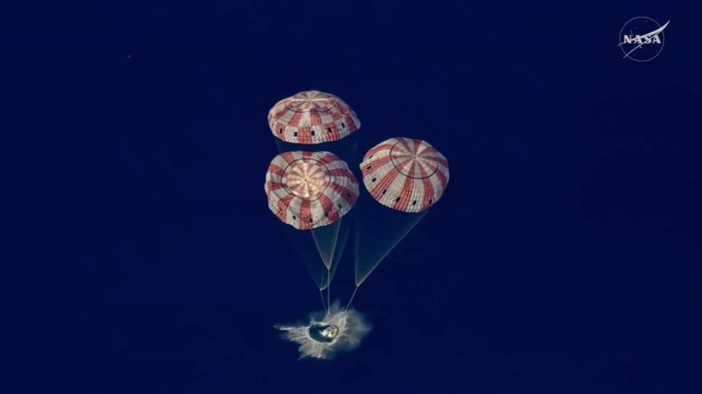Το σκάφος τους, το Ωρίων, έκανε την είσοδό του την ατμόσφαιρα με ταχύτητα πάνω από 38.000 χιλιόμετρα την ώρα και τις δυνάμεις τριβής να προκαλούν θερμοκρασίες πάνω από τους 2.700° Κελσίου. Προσθαλασσώθηκε σύμφωνα με το πρόγραμμα και χωρίς στον Ειρηνικό, επιβραδυνόμενο από μεγάλα αλεξίπτωτα, όπως ακριβώς την εποχή του προγράμματος Apollo.