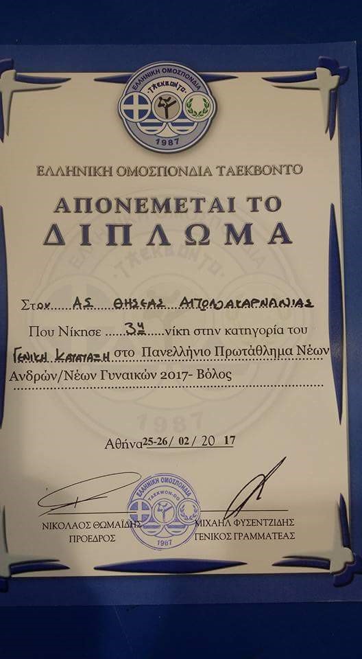 3ος σύλλογος στο πανελλήνιο πρωτάθλημα taekwondo U21 ο ΑΣ ΘΗΣΈΑΣ ΑΙΤ / ΝΙΑΣ. Καλλιφωνης - Μεσυνδιάνου στην εθνική ομάδα.