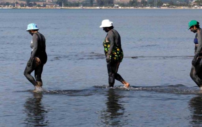 Τα μεσημέρια του καλοκαιριού στη στενή λωρίδα παραλίας της Αγίας Τριάδας στο Μεσολόγγι δεν υπάρχει ούτε μισό τετραγωνικό μέτρο ελεύθερο. Οι λουόμενοι καταφθάνουν ακόμα και με πούλμαν από γειτονικές πόλεις προκειμένου να «εμβαπτιστούν» στα ζεστά νερά της λιμνοθάλασσας και να καλυφθούν με τον ιαματικό πηλό των βυθών της.