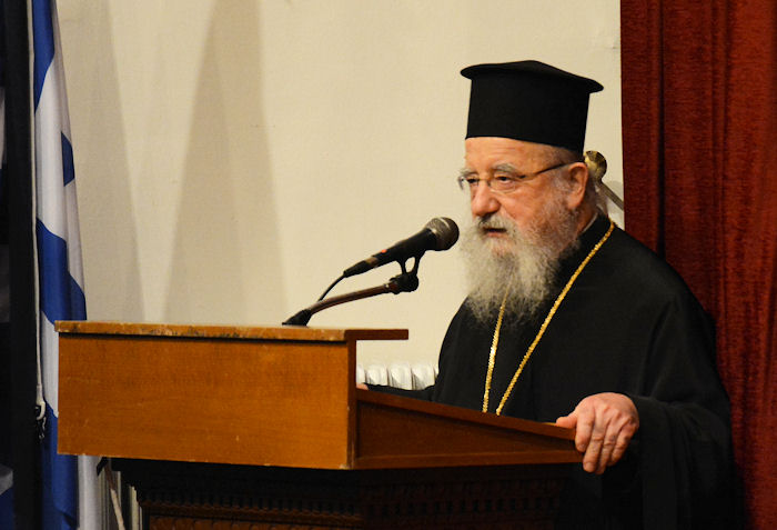 Προηγήθηκε ομιλία του Σεβασμιωτάτου Μητροπολίτου Πατρών κ. Χρυσοστόμου, ο οποίος ευχαρίστησε τον Σεβ. Ποιμενάρχη μας κ. Κοσμά για την πρόσκληση, ενώ με τον πατριωτικό και λυρικό του λόγο καθήλωσε το πλήθος του ακροατηρίου. Μίλησε για την ανεπανάληπτη Θυσία, την ιστορική Δόξα και τον επάξιο Ύμνο του Μεσολογγίου, τονίζοντας ότι: