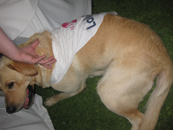 Η μασκώτ της διοργάνωσης ο σκύλος ΙΒΑΝ παίζει με τους δημοσιογράφους μετά την συνέντευξη.
