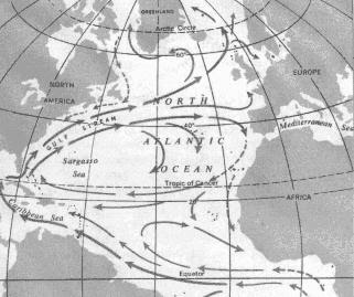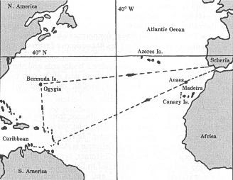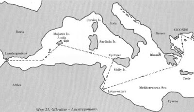 Σχεδιάγραμμα που παρουσιάζει την περιπλάνηση του Οδυσσέα μετά την πτώση της Τροίας βάσει των διαπιστώσεων της Εριέττας Μέρτζ (η οποία μελέτησε εδάφιο προς εδάφιο το κείμενο του Ομήρου σε συνδυασμό με διάφορες νεότερες ανακαλύψεις και παρατηρήσεις που αναφέρονται από τον ίδιο τον Όμηρο π.χ. διάρκεια ταξιδιού κλπ). Στον χάρτη επισημαίνονται η περιοχή που υπήρξαν οι Σειρήνες , σε ποιο σημείο της Αμερικάνικης ηπείρου ήταν η Σκύλλα και η Χάρυβδης και μέσο ποίας οδού ο Οδυσσέας επέστρεψε στην Ιθάκη βοηθούμενος καθ' όλη την διαδρομή από το ρεύμα του κόλπου (Gulf stream) .