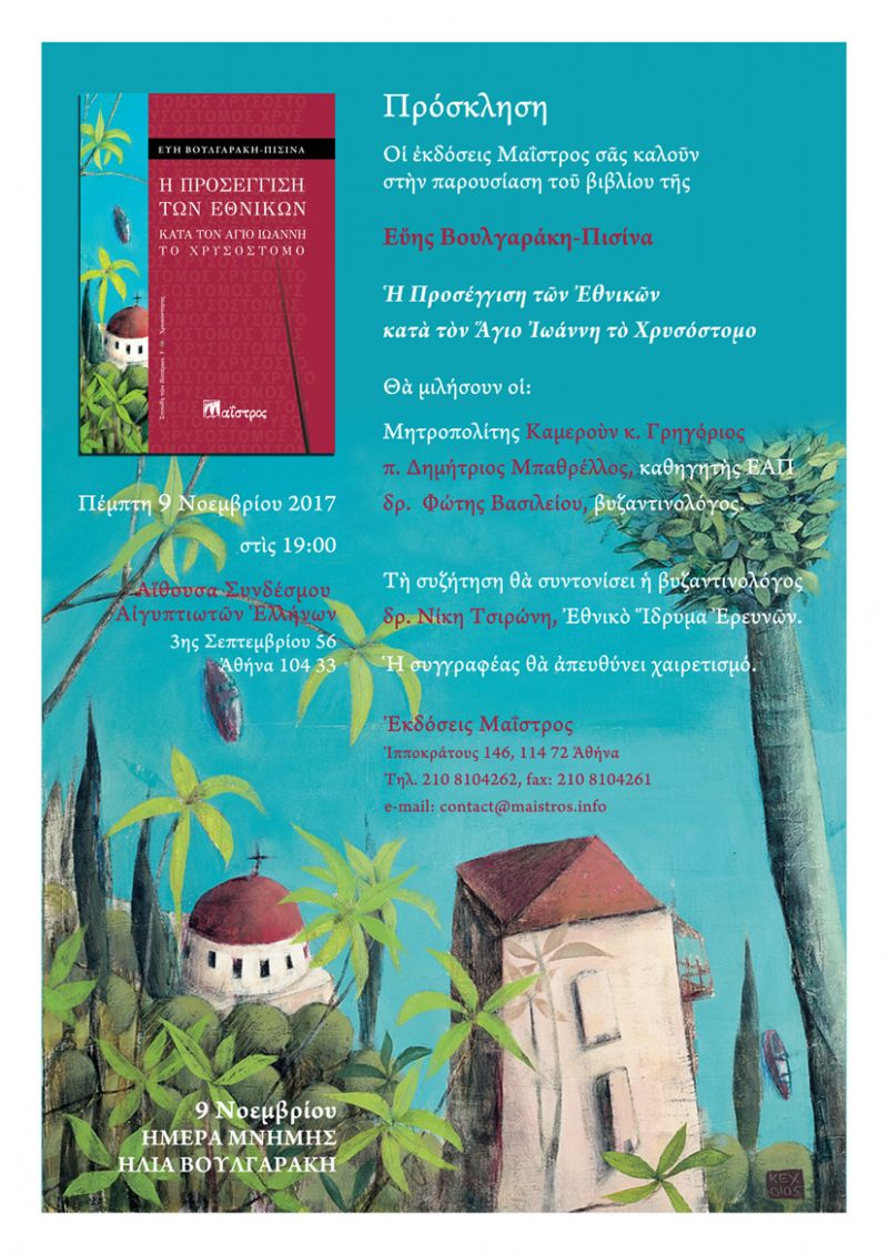 έχουμε την τιμή και τη χαρά να σας προσκαλέσουμε στην παρουσίαση του βιβλίου της Εύης Βουλγαράκη-Πισίνα, Η Προσέγγιση των Εθνικών κατά τον Άγιο Ιωάννη το Χρυσόστομο