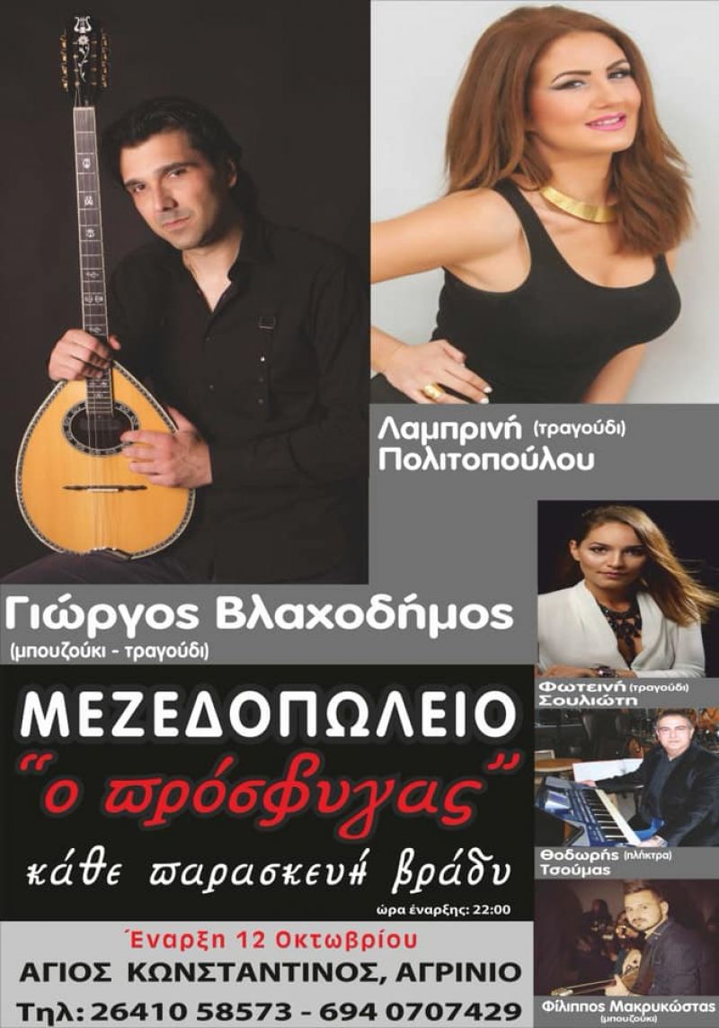 Το AgrinioBestOf.gr βρέθηκε την παρασκευή 12 Οκτωβρίου στο μεζεδοπωλείο «Ο Πρόσφυγας» στον Αγιο Κωνσταντίνο Αγρινίου, όπου εκτός από τους εκλεκτούς μεζέδες οι θαμώνες απόλαυσαν αχέξαστα Ελληνικά τραγούδια από την ορχήστρα του Γιώργου Βλαχοδήμου πλαισιωμένου από τις Λαμπρινή Πολιτοπούλου και Φωτεινή Σουλιώτη στο τραγούδι, τον Θοδωρή Τσούμα στα πλήκτρα και τον Φίλιπο Μακρυκώστα στο μπουζούκι. Η Χρύσα Σπαή μίλησε με τους τραγουδιστές του σχήματος και σας μεταφέρει τις ενυπώσεις τους.
