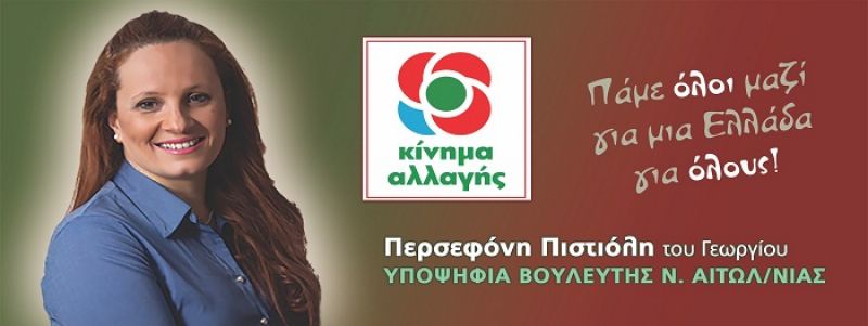 Στο ψηφοδέλτιο του Κινήματος Αλλαγής στην Αιτωλοακαρνανία θα συμμετάσχει η Περσεφόνη Πιστιόλη.