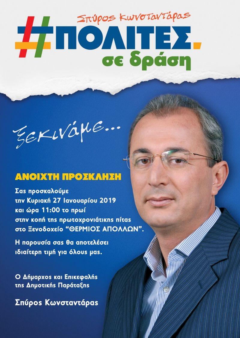 Σας προσκαλούμε την Κυριακή 27 Ιανουαρίου 2019 και ώρα 11:00 το πρωί στην κοπή της πρωτοχρονιάτικης πίτας στο Ξενοδοχείο "ΘΕΡΜΙΟΣ ΑΠΟΛΛΩΝ" .